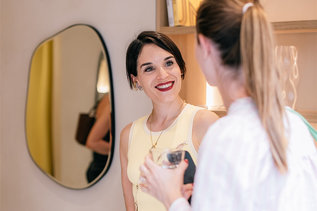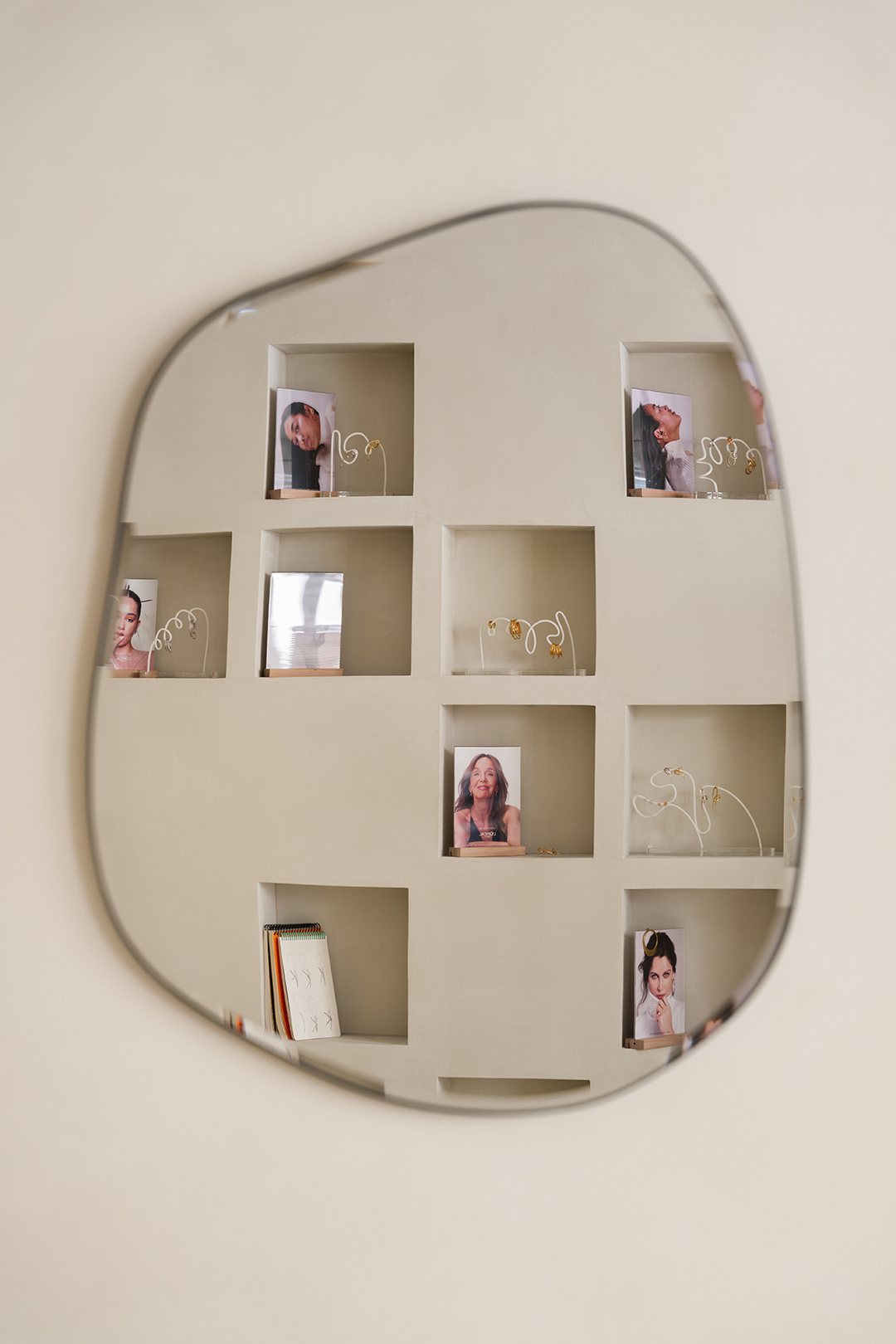 “J’ai imaginé la boutique comme un appartement, un lieu pour ralentir, flâner, ressentir. Les matériaux bruts mettent en valeur les bijoux, présentés comme dans un cabinet de curiosités. Le jaune des rideaux aimante le regard et le logo en lévitation ajoute une touche surréaliste.”